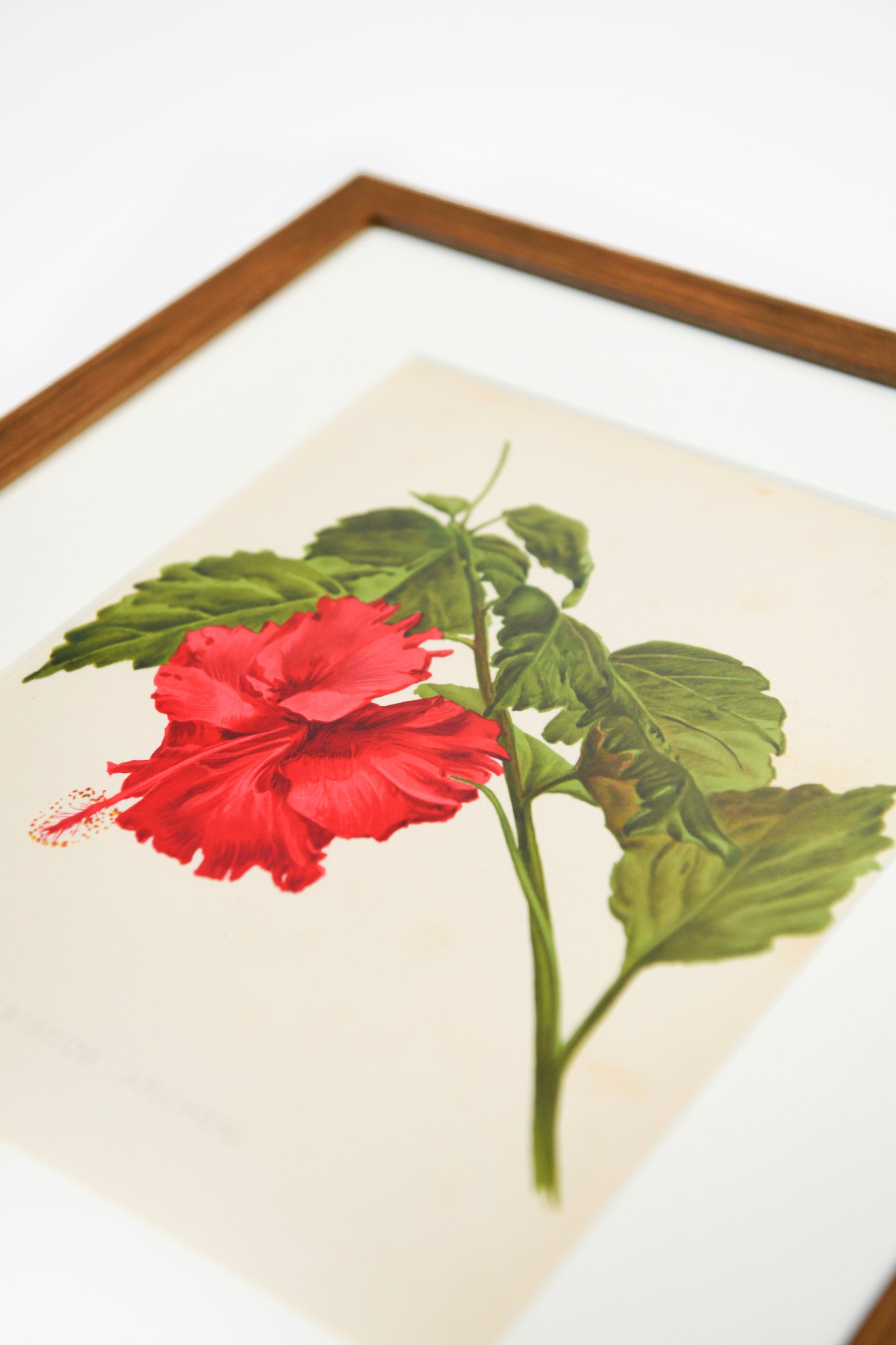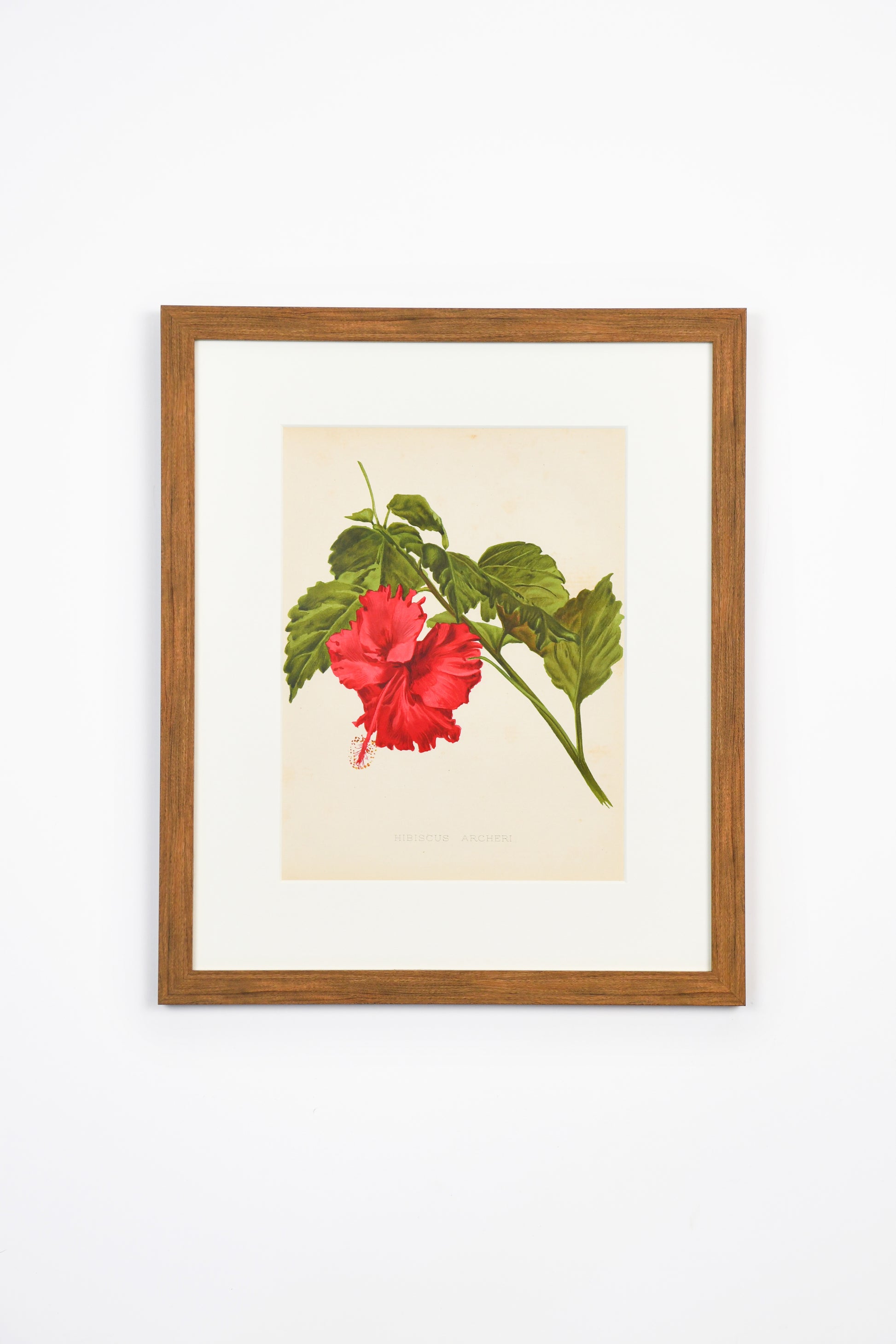 This vintage lithograph celebrates the lush beauty of a hibiscus flower, rendered in rich, deep pink hues that seem to pulse with natural vitality. The historical printing technique captures the subtle botanical textures while the clean lines of the maple frame provide an elegant, contemporary finishing touch that allows the flower's dramatic presence to shine. A perfect marriage of vintage botanical artistry and refined presentation.